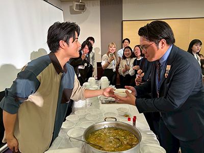 昨年に引き続きオープニングムービーから幕を開けた本大会ですが、メインプログラムでは、情報番組『ZIP!』の「旅するエプロン」でおなじみの池田航様をお招きし、石川県の郷土料理である「めった汁」の調理を実演していただきました。